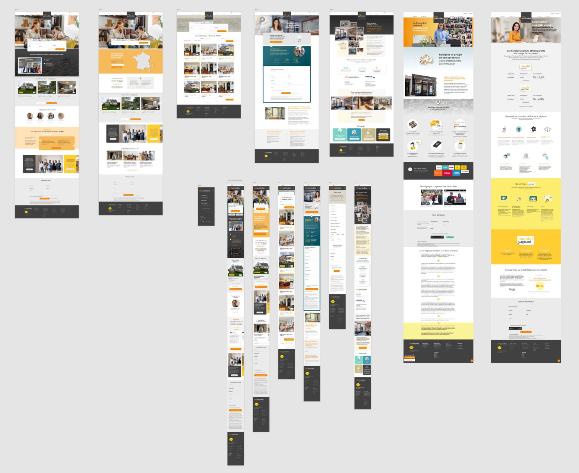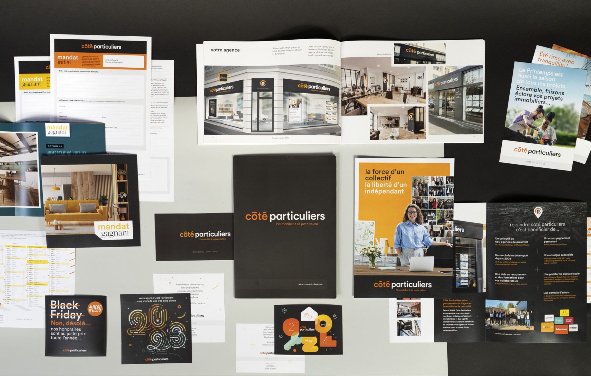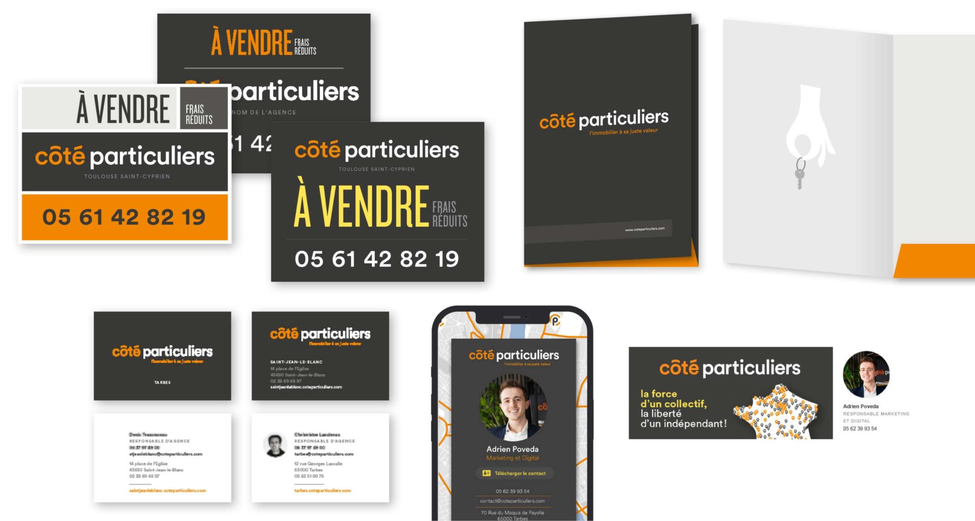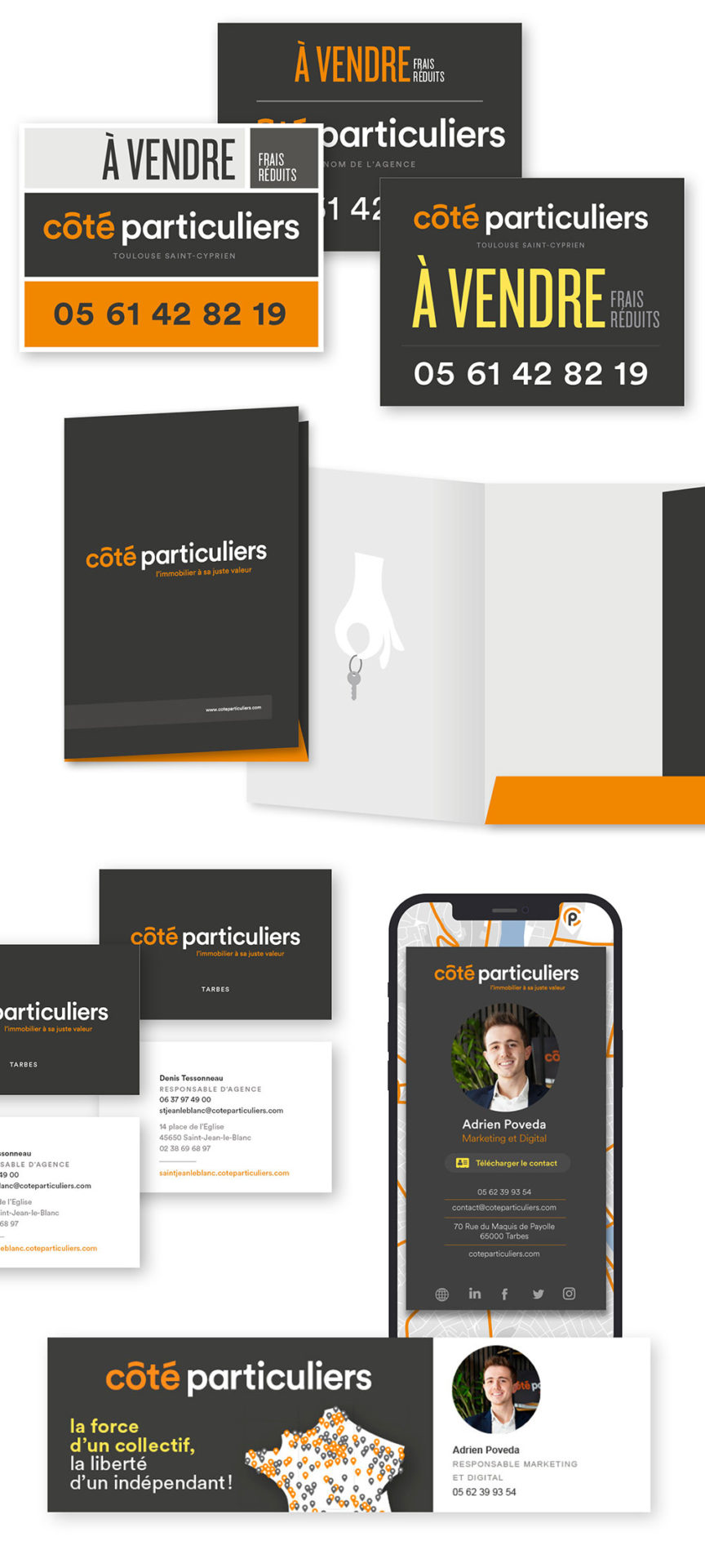 Au fur et à mesure des ses besoins Côté Particuliers a créé des marques produits : des mandats pour organiser l’offre client, un outil de coopération pour les agents, une interface d’administration pour la gestion des agences. Formo a accompagné la marque et donné formes à ces offres.