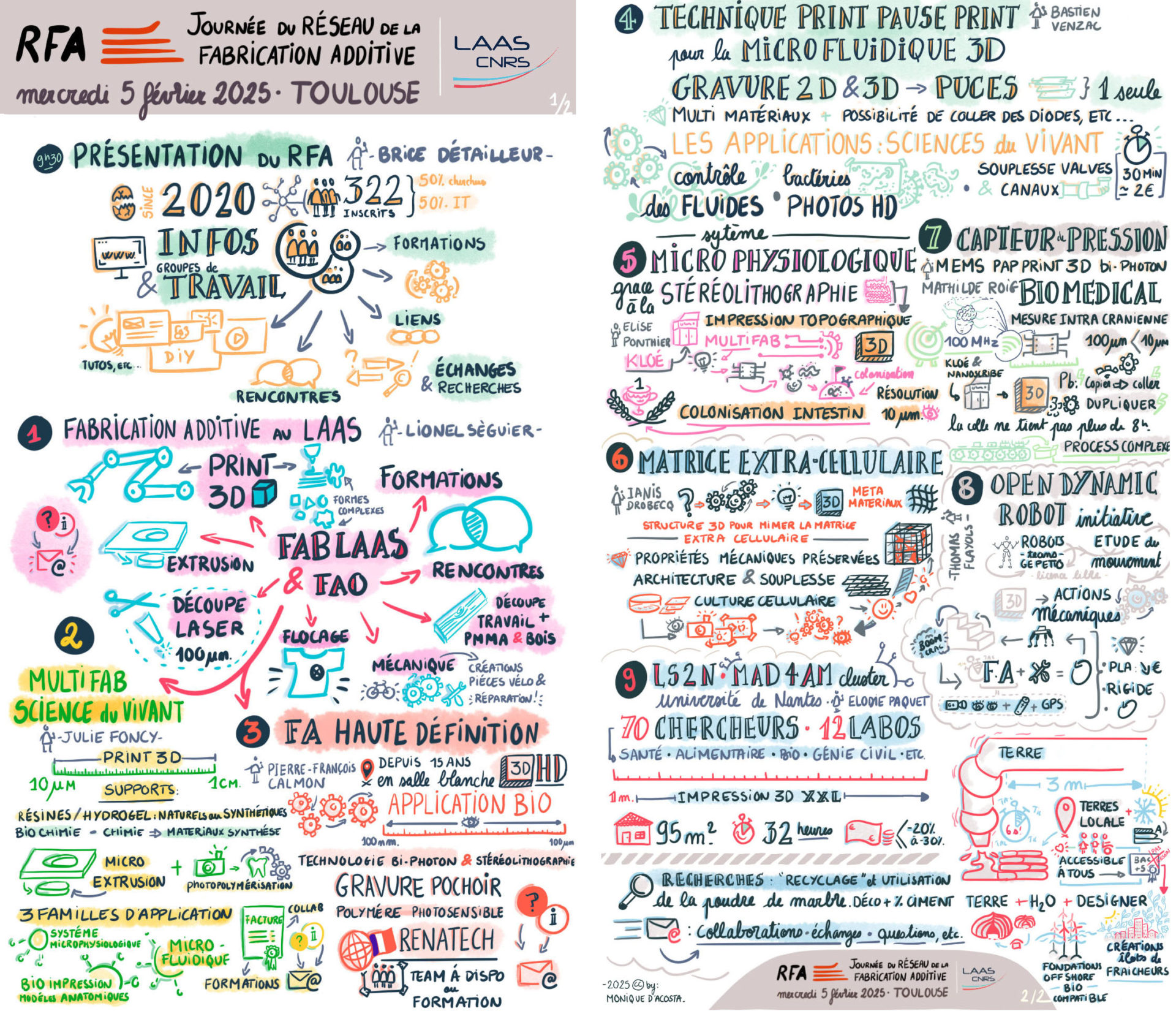 Le LAAS, c’est le laboratoire d’analyse et architecture des systèmes du CNRS associé à l’Université Toulouse Midi-Pyrénées. Février 2025, cette unité de recherche nous contacte pour capter en dessin la journée du Réseau de la Fabrication Additive (RFA), organisée cette année-là au LAAS CNRS. Une journée de rencontre et de présentation des projets du labo synthétisée graphiquement grâce à la facilitation graphique.